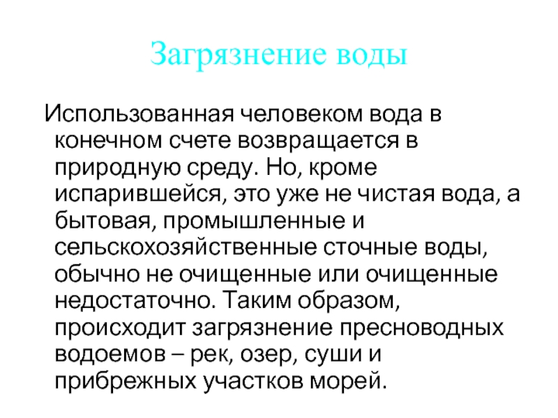 среду. Но, кроме испарившейся, это уже не чистая вода, а бытовая, промышленные и сельскохозяйственные сточные воды, обычно не очищенные или очищенные недостаточно. Таким образом, происходит загрязнение пресноводных водоемов – рек, озер, суши и прибрежных участков морей.