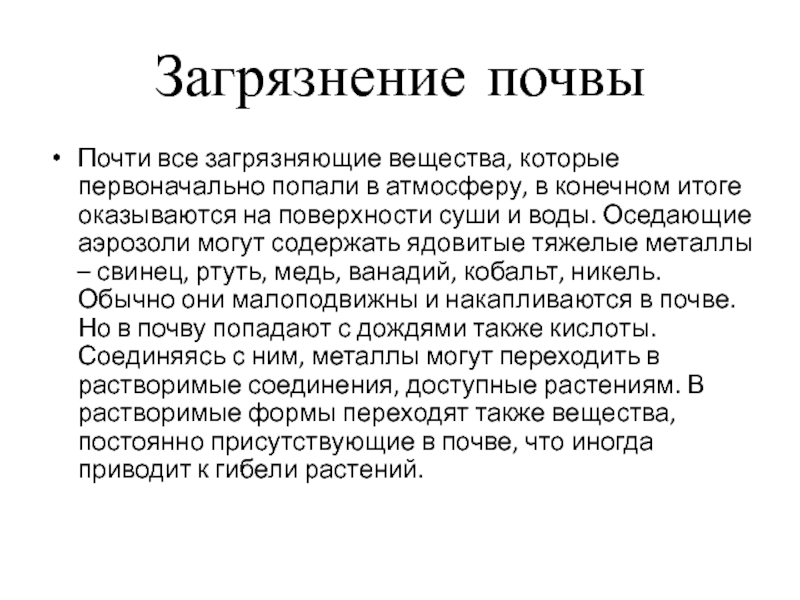 конечном итоге оказываются на поверхности суши и воды. Оседающие аэрозоли могут содержать ядовитые тяжелые металлы – свинец, ртуть, медь, ванадий, кобальт, никель. Обычно они малоподвижны и накапливаются в почве. Но в почву попадают с дождями также кислоты. Соединяясь с ним, металлы могут переходить в растворимые соединения, доступные растениям. В растворимые формы переходят также вещества, постоянно присутствующие в почве, что иногда приводит к гибели растений.