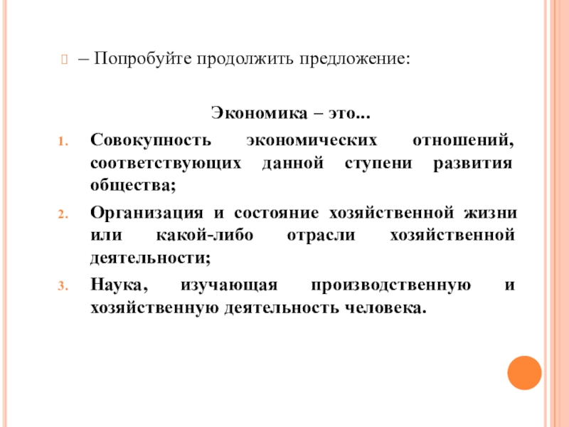 – Попробуйте продолжить предложение:Экономика – это...Совокупность экономических отношений, соответствующих данной ступени развития общества;Организация и состояние хозяйственной жизни