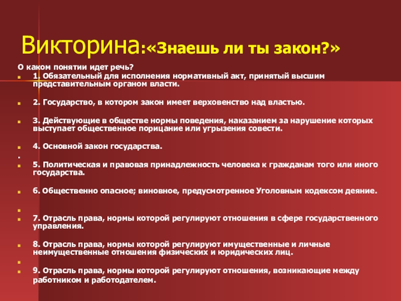 Слайд 26Викторина:«Знаешь ли ты закон?»