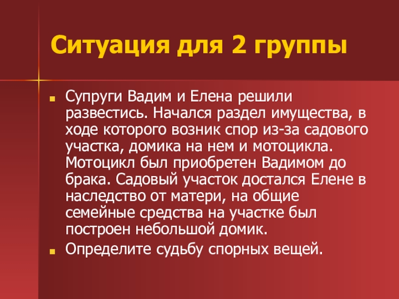 имущества, в ходе которого возник спор из-за садового участка, домика на нем и мотоцикла. Мотоцикл был приобретен Вадимом до брака. Садовый участок достался Елене в наследство от матери, на общие семейные средства на участке был построен небольшой домик.