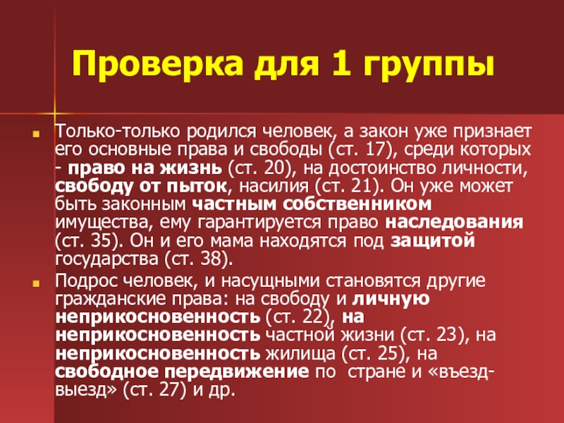 Подрос человек, и насущными становятся другие гражданские права: на свободу и личную неприкосновенность (ст. 22), на неприкосновенность частной жизни (ст. 23), на неприкосновенность жилища (ст. 25), на свободное передвижение по стране и «въезд-выезд» (ст. 27) и др.