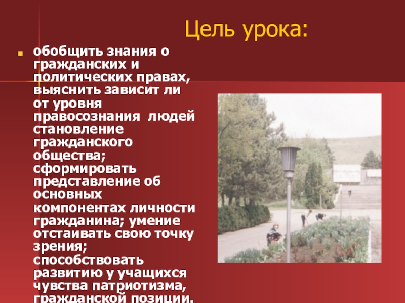 обобщить знания о гражданских и политических правах, выяснить зависит ли от уровня правосознания людей становление гражданского общества; сформировать представление об основных компонентах личности гражданина; умение отстаивать свою точку зрения; способствовать развитию у учащихся чувства патриотизма, гражданской позиции.
