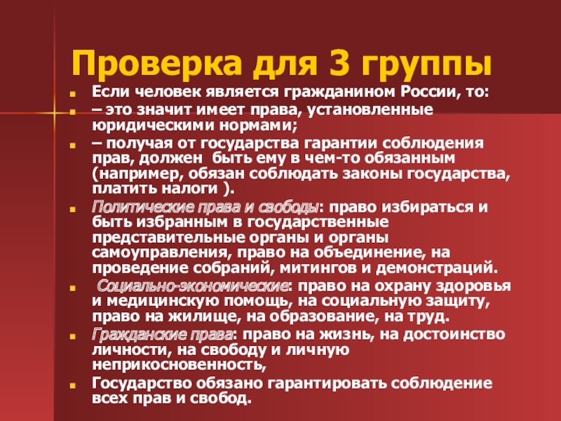 – получая от государства гарантии соблюдения прав, должен быть ему в чем-то обязанным (например, обязан соблюдать законы государства, платить налоги ).
