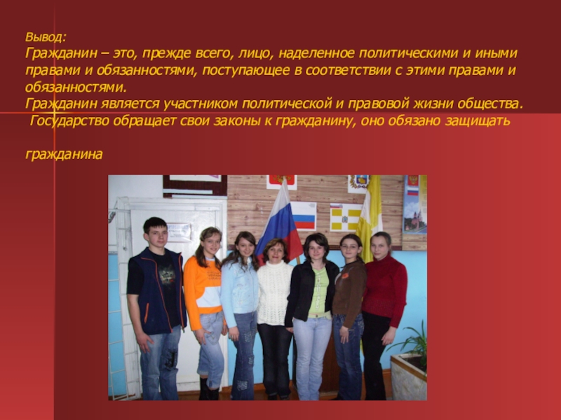 а ж д а н и н - самостоятельный, сознающий себя таковым член общества, обладающий правами и несущий ответственность за все свои поступки и действия.