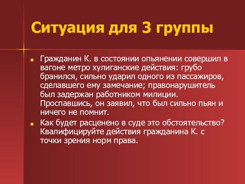 метро хулиганские действия: грубо бранился, сильно ударил одного из пассажиров, сделавшего ему замечание; правонарушитель был задержан работником милиции. Проспавшись, он заявил, что был сильно пьян и ничего не помнит.