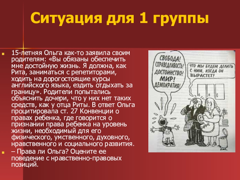 обеспечить мне достойную жизнь. Я должна, как Рита, заниматься с репетиторами, ходить на дорогостоящие курсы английского языка, ездить отдыхать за границу». Родители попытались объяснить дочери, что у них нет таких средств, как у отца Риты. В ответ Ольга процитировала ст. 27 Конвенции о правах ребенка, где говорится о признании права ребенка на уровень жизни, необходимый для его физического, умственного, духовного, нравственного и социального развития.
