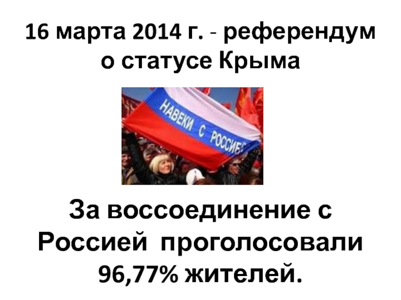 16 марта 2014 г. - референдум  о статусе КрымаЗа воссоединение с Россией проголосовали  96,77% жителей.
