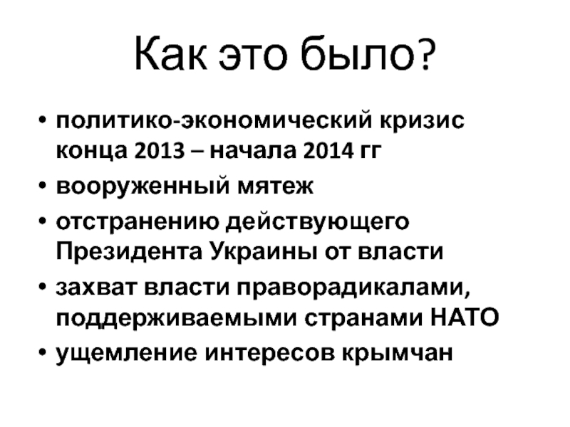 Как это было?политико-экономический кризис конца 2013 – начала 2014 ггвооруженный мятежотстранению действующего Президента Украины от властизахват власти