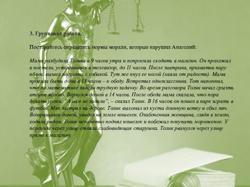 3. Групповая работа.Постарайтесь определить нормы морали, которые нарушил Анатолий:Мама разбудила Толика в 9 часов утра и попросила