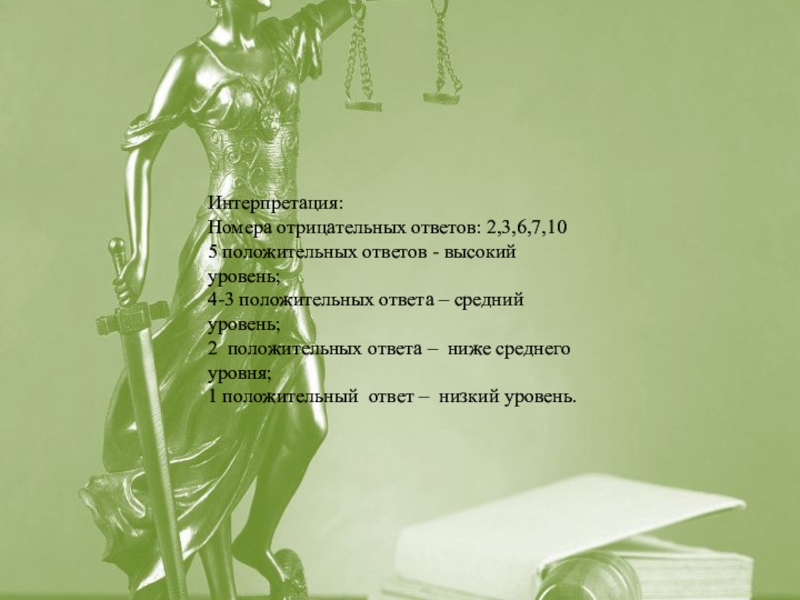 Интерпретация:Номера отрицательных ответов: 2,3,6,7,105 положительных ответов - высокий уровень;4-3 положительных ответа – средний уровень;2  положительных ответа –