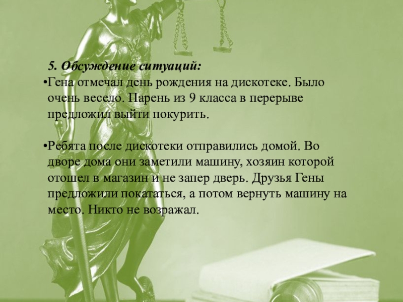 5. Обсуждение ситуаций:Гена отмечал день рождения на дискотеке. Было очень весело. Парень из 9 класса в перерыве