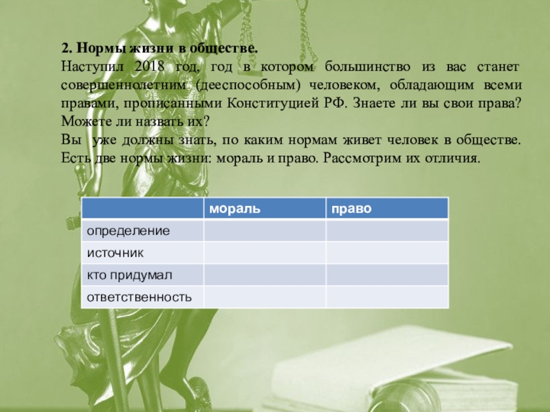 2. Нормы жизни в обществе.Наступил 2018 год, год в котором большинство из вас станет совершеннолетним (дееспособным) человеком,