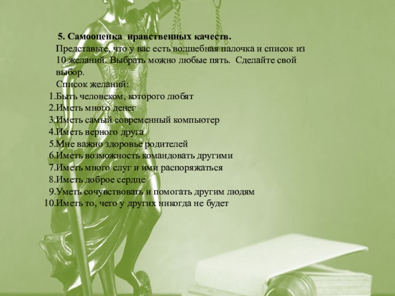 5. Самооценка  нравственных качеств.Представьте, что у вас есть волшебная палочка и список из 10 желаний. Выбрать