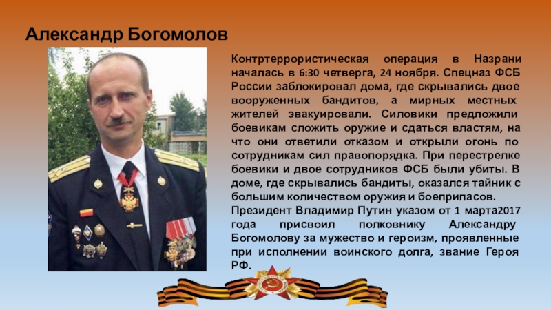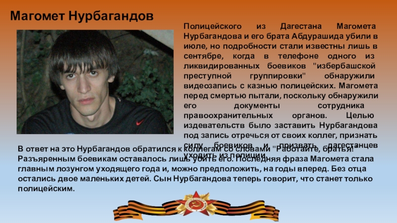 В ответ на это Нурбагандов обратился к коллегам со словами "Работайте, братья!" Разъяренным боевикам оставалось лишь убить его. Последняя фраза Магомета стала главным лозунгом уходящего года и, можно предположить, на годы вперед. Без отца остались двое маленьких детей. Сын Нурбагандова теперь говорит, что станет только полицейским.