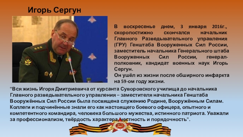"Вся жизнь Игоря Дмитриевича от курсанта Суворовского училища до начальника Главного разведывательного управления – заместителя начальника Генштаба Вооружённых Сил России была посвящена служению Родине, Вооружённым Силам. Коллеги и подчинённые знали его как настоящего боевого офицера, опытного и компетентного командира, человека большого мужества, истинного патриота. Уважали за профессионализм, твёрдость характера, честность и порядочность".