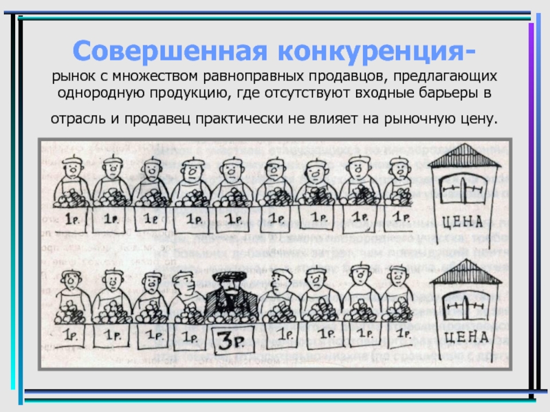 Слайд 10 Совершенная конкуренция- рынок с множеством равноправных продавцов, предлагающих однородную продукцию, где