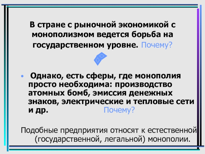 В стране с рыночной экономикой с монополизмом ведется борьба на государственном уровне. Почему? Однако, есть сферы, где