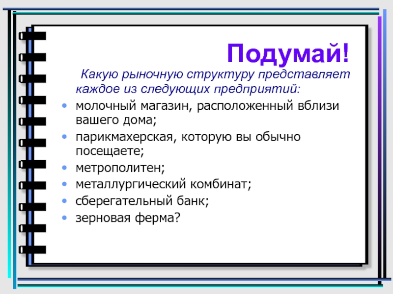 Какую рыночную структуру представляет каждое из следующих предприятий:молочный магазин, расположенный вблизи вашего дома; парикмахерская, которую вы обычно