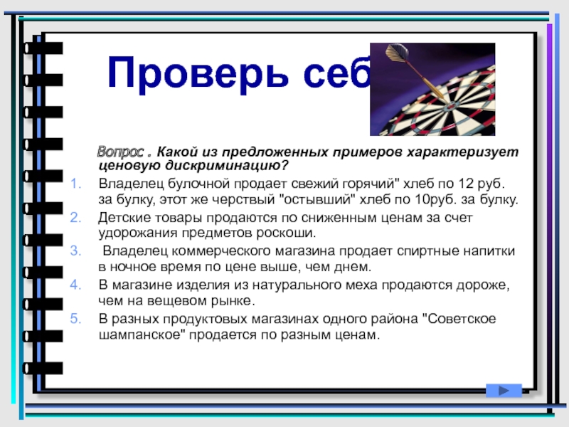 Проверь себя   Вопрос . Какой из предложенных примеров характеризует ценовую дискриминацию?Владелец булочной