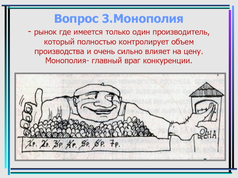 Слайд 14Вопрос 3.Монополия - рынок где имеется только один производитель, который полностью контролирует