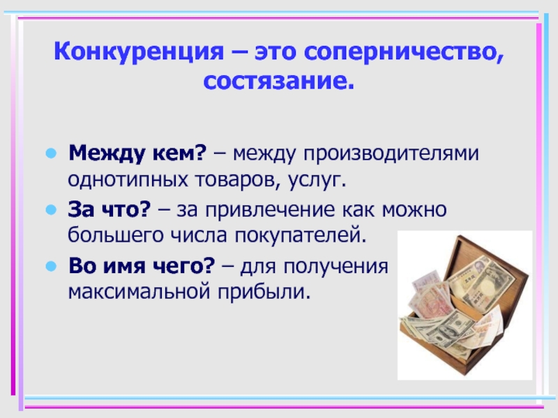 Конкуренция – это соперничество, состязание.Между кем? – между производителями однотипных товаров, услуг.За что? – за привлечение как
