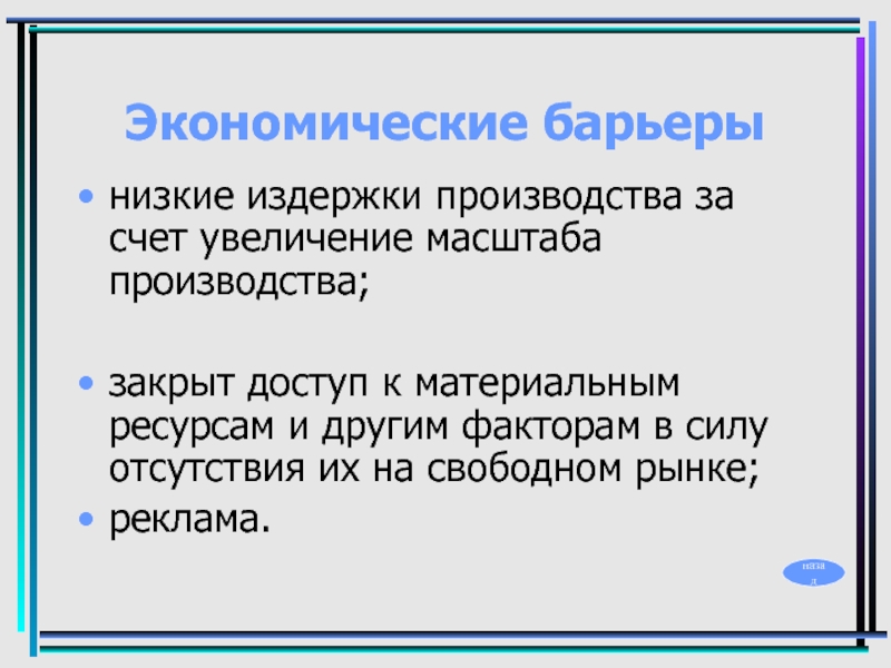 Экономические барьерынизкие издержки производства за счет увеличение масштаба производства;закрыт доступ к материальным ресурсам и другим факторам в