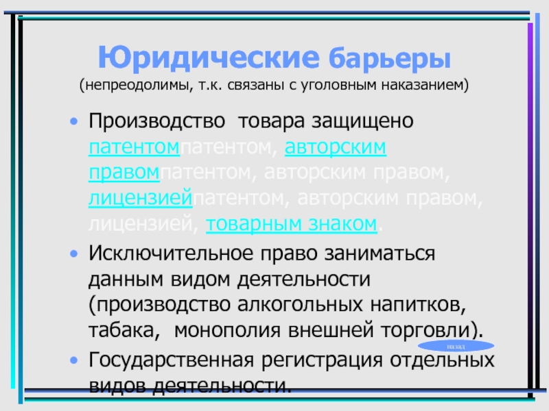 Юридические барьеры (непреодолимы, т.к. связаны с уголовным наказанием)Производство товара защищено патентомпатентом, авторским правомпатентом, авторским правом, лицензиейпатентом, авторским