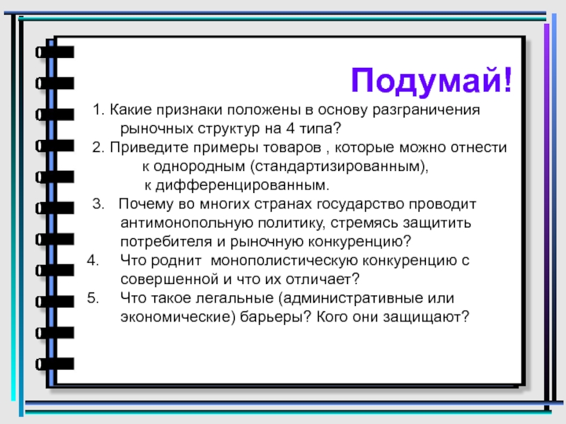 Подумай!1. Какие признаки положены в основу разграничения рыночных структур на 4 типа?2. Приведите примеры товаров , которые