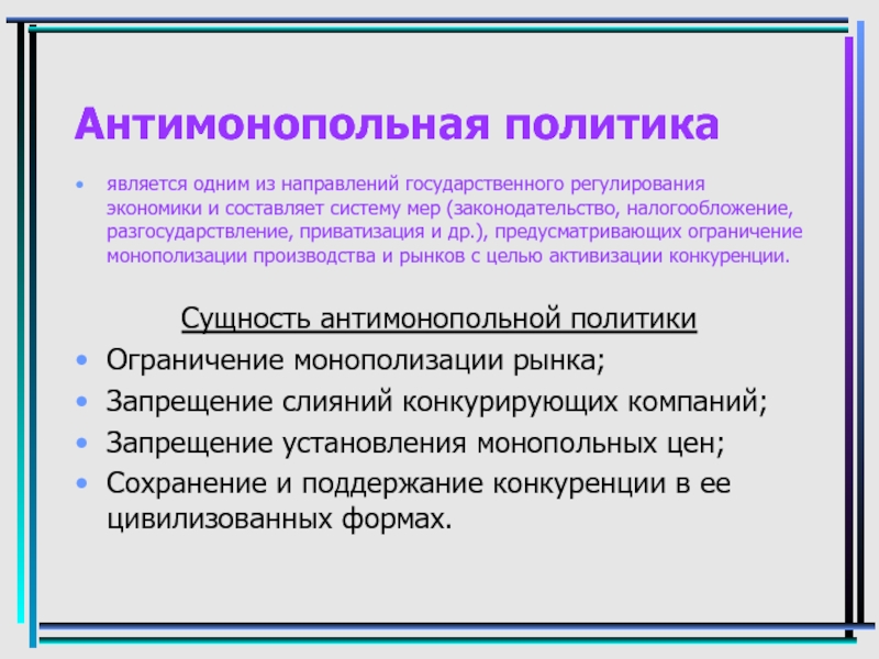 Антимонопольная политикаявляется одним из направлений государственного регулирования экономики и составляет систему мер (законодательство, налогообложение, разгосударствление, приватизация и