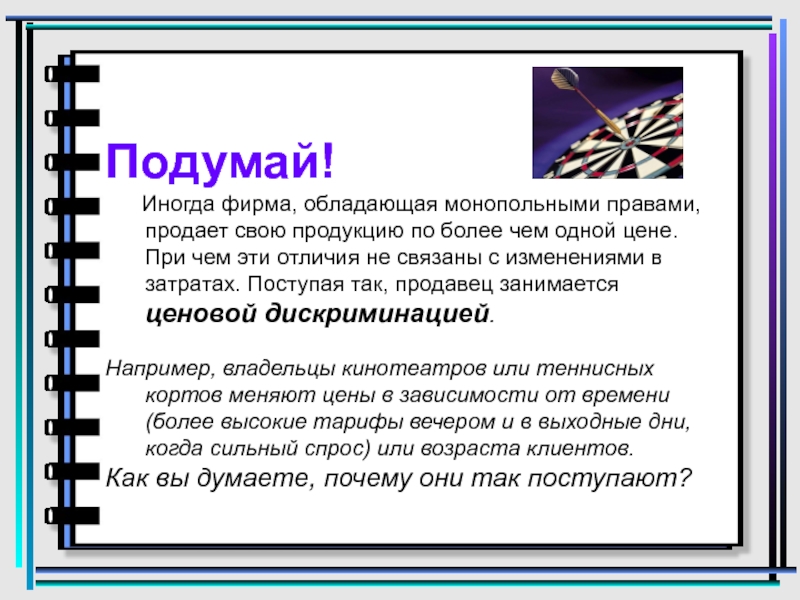 Подумай!   Иногда фирма, обладающая монопольными правами, продает свою продукцию по более чем одной цене. При