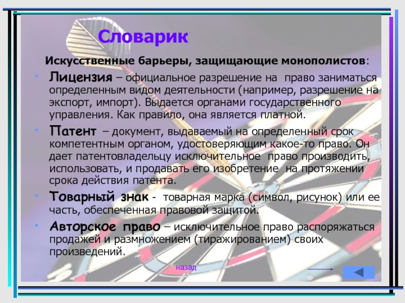 Искусственные барьеры, защищающие монополистов:Лицензия – официальное разрешение на право заниматься определенным видом деятельности (например, разрешение на экспорт,