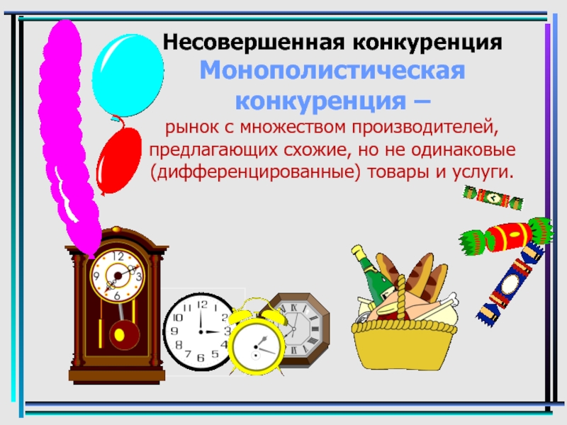 Несовершенная конкуренция Монополистическая  конкуренция –  рынок с множеством производителей, предлагающих схожие, но не одинаковые (дифференцированные)