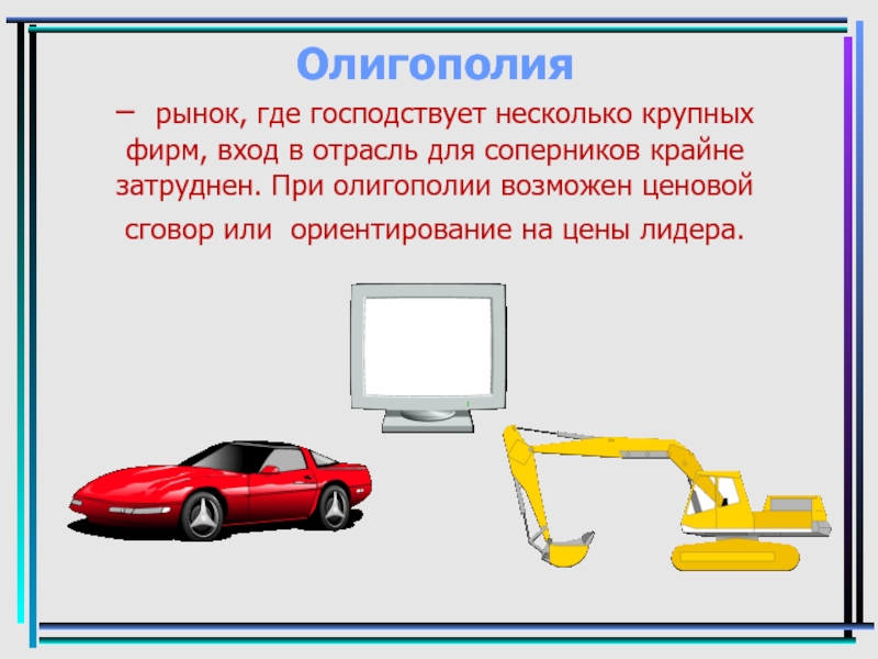 Слайд 12Олигополия – рынок, где господствует несколько крупных фирм, вход в отрасль