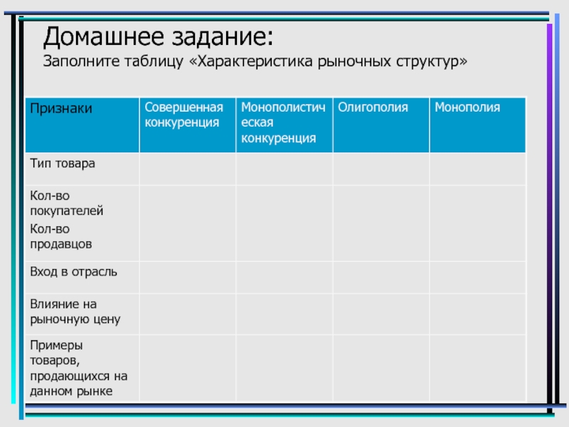 Домашнее задание: Заполните таблицу «Характеристика рыночных структур»