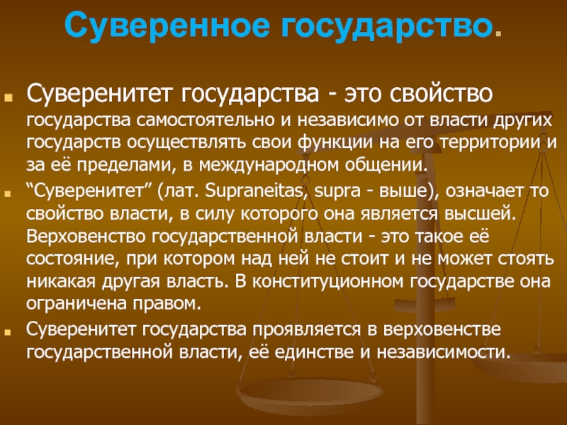 “Суверенитет” (лат. Supraneitas, supra - выше), означает то свойство власти, в силу которого она является высшей. Верховенство государственной власти - это такое её состояние, при котором над ней не стоит и не может стоять никакая другая власть. В конституционном государстве она ограничена правом.