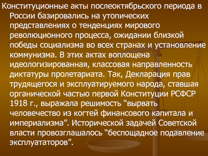 тенденциях мирового революционного процесса, ожидании близкой победы социализма во всех странах и установление коммунизма. В этих актах воплощена идеологизированная, классовая направленность диктатуры пролетариата. Так, Декларация прав трудящегося и эксплуатируемого народа, ставшая органической частью первой Конституции РСФСР 1918 г., выражала решимость “вырвать человечество из когтей финансового капитала и империализма”. Исторической задачей Советской власти провозглашалось “беспощадное подавление эксплуататоров”.
