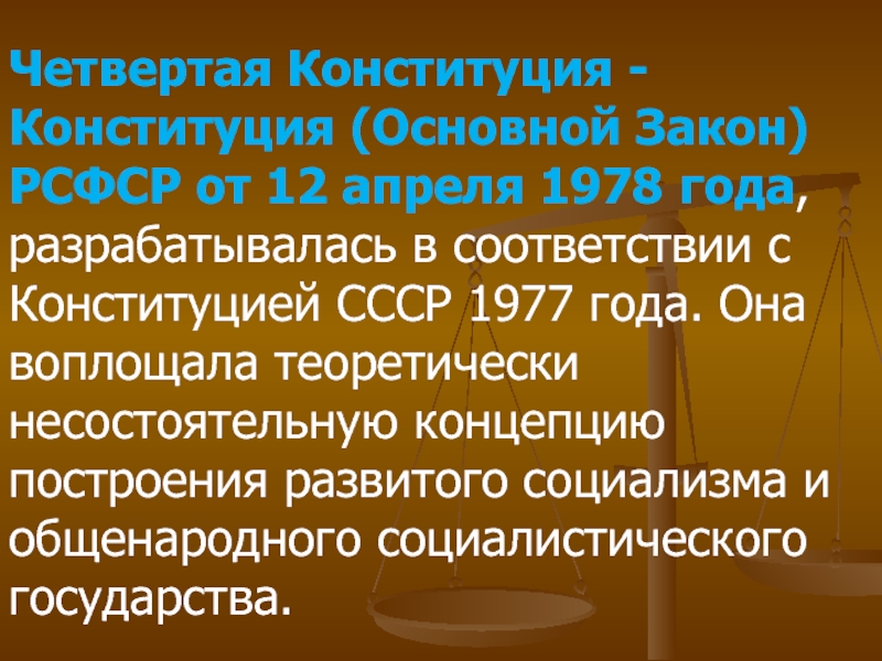 Слайд 24Четвертая Конституция - Конституция (Основной Закон) РСФСР от 12 апреля 1978