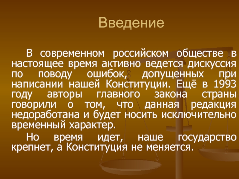 поводу ошибок, допущенных при написании нашей Конституции. Ещё в 1993 году авторы главного закона страны говорили о том, что данная редакция недоработана и будет носить исключительно временный характер.
