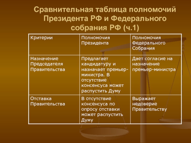 Слайд 46Сравнительная таблица полномочий Президента РФ и Федерального собрания РФ (ч.1)