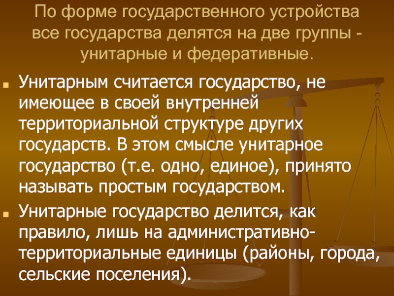 Унитарные государство делится, как правило, лишь на административно-территориальные единицы (районы, города, сельские поселения).