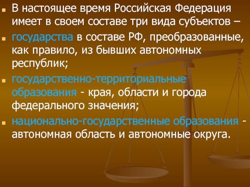 Слайд 38В настоящее время Российская Федерация имеет в своем составе три вида