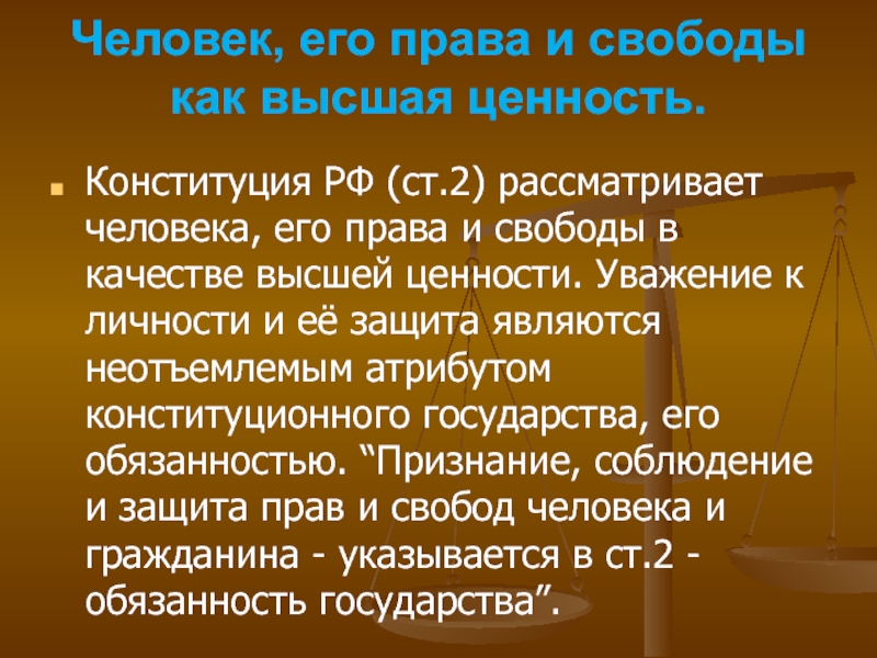 рассматривает человека, его права и свободы в качестве высшей ценности. Уважение к личности и её защита являются неотъемлемым атрибутом конституционного государства, его обязанностью. “Признание, соблюдение и защита прав и свобод человека и гражданина - указывается в ст.2 - обязанность государства”.
