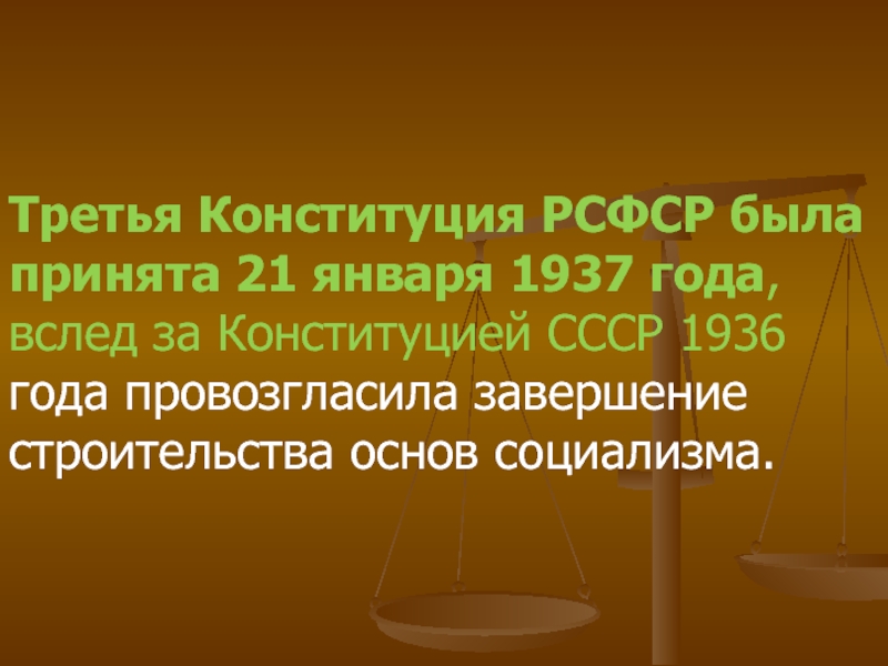 Слайд 23Третья Конституция РСФСР была принята 21 января 1937 года, вслед за