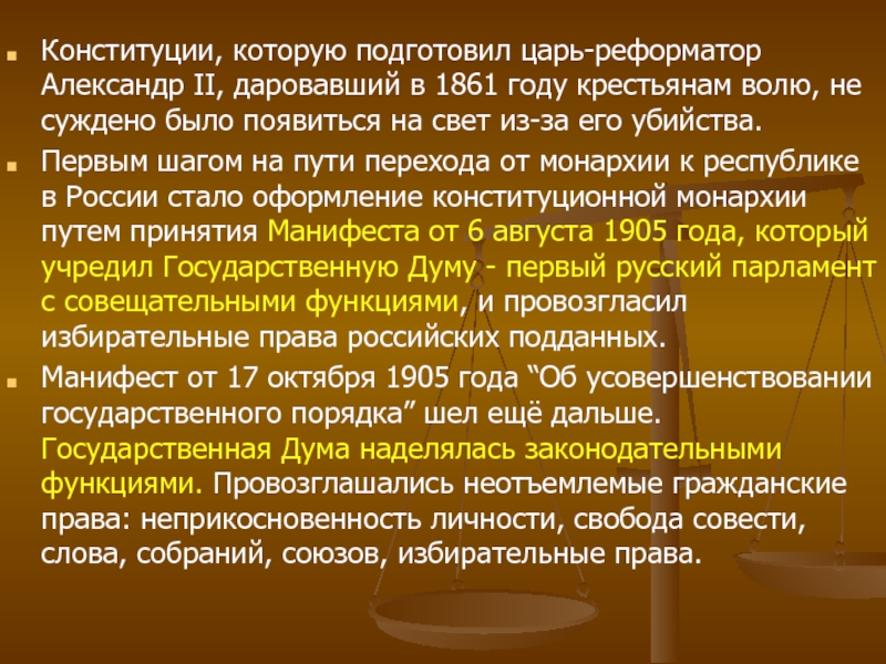 Слайд 16Конституции, которую подготовил царь-реформатор Александр II, даровавший в 1861 году крестьянам