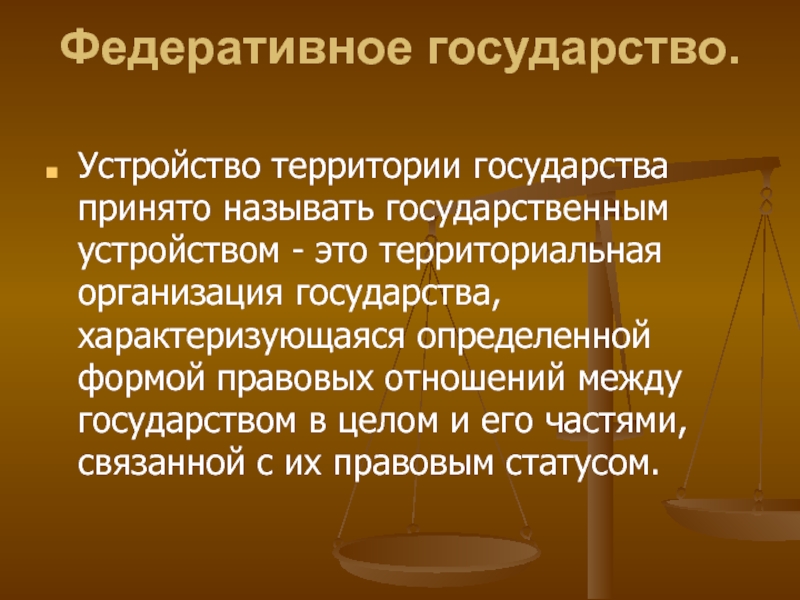 организация государства, характеризующаяся определенной формой правовых отношений между государством в целом и его частями, связанной с их правовым статусом.