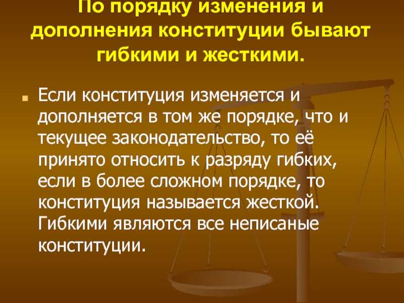 конституция изменяется и дополняется в том же порядке, что и текущее законодательство, то её принято относить к разряду гибких, если в более сложном порядке, то конституция называется жесткой. Гибкими являются все неписаные конституции.