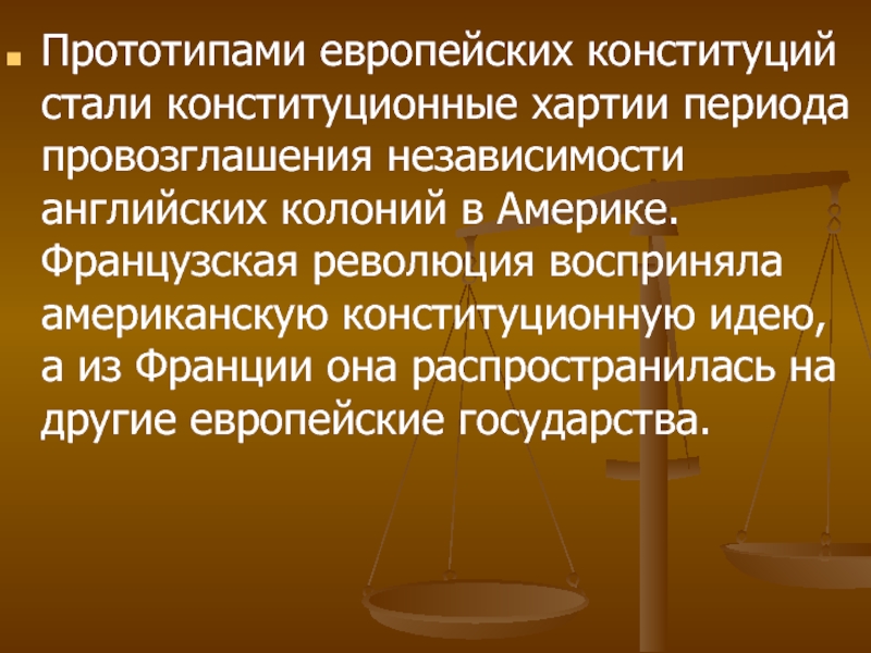 Слайд 9Прототипами европейских конституций стали конституционные хартии периода провозглашения независимости английских колоний