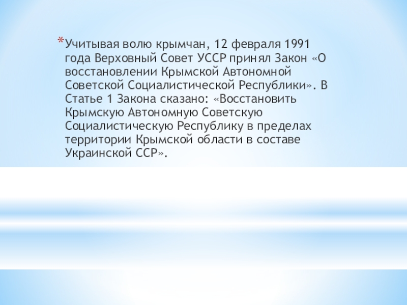 Слайд 5Учитывая волю крымчан, 12 февраля 1991 года Верховный Совет УССР принял