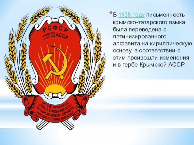 Слайд 12В 1938 году письменность крымско-татарского языка была переведена с латинизированного алфавита на кириллическую